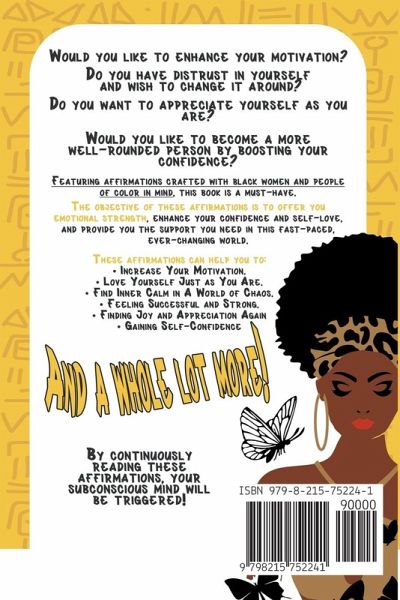 Would you like to enhance your motivation? Do you have distrust in yourself and wish to change it around? Do you want to appreciate yourself as you are? Would you like to become a more well-rounded person by boosting your confidence? If you answered YES to at least one question above, then this book is for you. We Black women have a collective history of grit and determination; our individual levels of achievement and confidence may vary, but we are a sisterhood with unlimited potential because of our shared heritage. Featuring affirmations crafted with black women and people of color in mind, this book is a must-have. The objective of these affirmations is to offer you emotional strength, enhance your confidence and self-love, and provide you the support you need in this fast-paced, ever-changing world. These affirmations can help you to:Increase Your Motivation. Love Yourself Just as You Are. Find Inner Calm in A World of Chaos. Feeling Successful and Strong. Finding Joy and Appreciation Again Gaining Self-Confidence And a lot more! By continuously reading these affirmations, your subconscious mind will be triggered, and you will begin to feel more optimistic about yourself and the world around you.