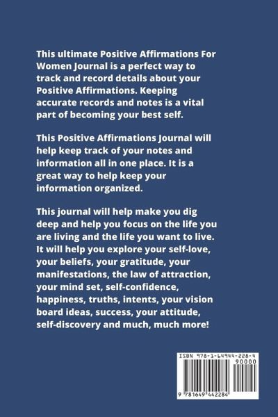 This Positive Affirmations Journal is a perfect way to change your life by changing your thoughts. Daily repeating affirmations is easy, but an effective affirmation is more than just the words you speak. This journal will help make you dig deep and help you focus on the life you are living and the life you want to live. It will help you explore your self-love, your beliefs, your gratitude, your manifestations, the law of attraction, your mind set, self-confidence, happiness, truths, intents, your vision board ideas, success, your attitude, self-discovery and much, much more. Each page is unique and has a different set of prompts for you to write the answers to. Start to discover new truths about yourself. Put your thoughts on paper and manifest the life you want. Easy to use it every day. Great for men, women, young adults, students, children, and kids. Get one today! Size is 6x9 inches, 124 pages, quality white paper, soft matte finish cover, paperback.