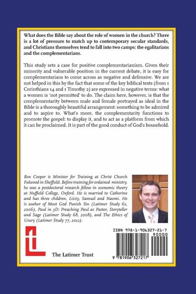 What does the Bible say about the role of women in the church? There is a lot of pressure to match up to contemporary secular standards, and Christians themselves tend to fall into two camps: the egalitarians and the complementarieans. This study sets a case for positive complementarianism. Given their minority and vulnerable position in the current debate, it is easy for complementarians to come across as negative and defensive. We are not helped in this by the fact that some of the key biblical texts (from 1 Corinthians 14 and 1 Timothy 2) are expressed in negative terms: what a women is 'not permitted' to do. The claim here, however, is that the complementarity between male and female portrayed as ideal in the Bible is a thoroughly beautiful arrangement: something to be admired and to aspire to. What's more, the complementarity functions to promote the gospel: to display it, and to act as a platform from which it can be proclaimed. It is part of the good conduct of God's household. Ben Cooper is Minister for Training at Christ Church Fulwood in Sheffield. Before training for ordained ministry, he was a postdoctoral research fellow in economic theory at Nuffield College, Oxford. He is married to Catherine and has three children, Lizzy, Samuel and Naomi. He is author of Must God Punish Sin (Latimer Study 62, 2006), Paul in 3D: Preaching Paul as Pastor, Storyteller and Sage (Latimer Study 68, 2008), and The Ethics of Usury (Latimer Study 77, 2012).
