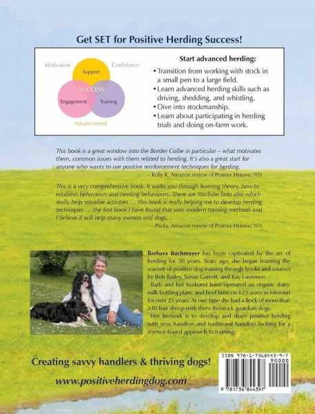 Is your herding dog ready to work livestock? If so, the dream of you and your dog becoming a herding team is coming true and this book can be your guide! To use this book successfully, your dog needs basic herding skills in place that were taught using science-based positive dog training, such as taught in Positive Herding 101. Let's look at the skills your dog needs to move forward with Positive Herding 201. First, your dog should be able to focus on stock while listening to you. Next, your dog needs these basic herding skills in place that were taught without livestock: · Flanking or circling in both directions · Stopping · Walking in The goal of Positive Herding 201 is to move you and your dog from working penned stock to loose stock. Eventually, your dog will be able to compete in herding trials and handle livestock on your acreage. At this stage of training, your dog will be honing their skills on penned stock. It is finally time for the FUN stuff! This book provides clear explanations, step-by-step training plans, troubleshooting suggestions, video links, and tons of pictures to create savvy handlers and thriving dogs. It's almost like having your own herding dog trainer on retainer! Barbara Buchmayer has over 30 years of herding experience and coached Sally Adam of South Africa from a complete herding newbie to a South African Sheepdog Association's reserve herding champion. This revolutionary new way to train herding is sheep tested, dog approved.