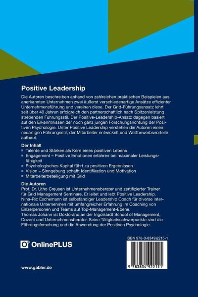 Die Autoren beschreiben anhand von zahlreichen praktischen Beispielen aus erfolgreichen Unternehmen zwei äußerst verschiedenartige Ansätze erfolgreicher Unternehmensführung und vereinen diese. Der GRID-Führungsansatz lehrt seit über 40 Jahren erfolgreich den partnerschaftlich nach Spitzenleistung strebenden Führungsstil. Der Positive-Leadership-Ansatz dagegen basiert auf den Erkenntnissen der noch ganz jungen Forschungsrichtung der Positiven Psychologie. Unter Positive Leadership verstehen die Autoren einen neuartigen Führungsstil, der Mitarbeiter entwickelt und Wettbewerbsvorteile aufbaut.
