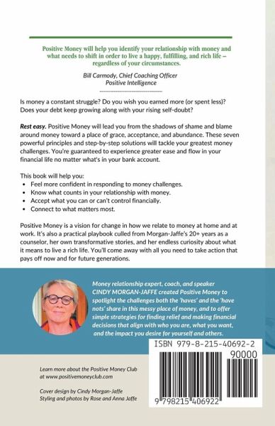 "Positive Money will help you identify your relationship with money and what needs to shift in order to live a happy, fulfilling, and rich life – regardless of your circumstances." - Bill Carmody, Chief Coaching Officer of Positive Intelligence Is money a constant struggle? Do you wish you earned more (or spent less)? Does your debt keep growing along with your rising self-doubt? Rest easy. Positive Money will lead you from the shadows of shame and blame around money toward a place of grace, acceptance, and abundance. These seven powerful principles and step-by-step solutions will tackle your greatest money challenges. You're guaranteed to experience greater ease and flow in your financial life. This book will help you:Feel more confident in responding to money challenges. Know what counts in your relationship with money. Accept what you can or can't control financially. Connect to what matters most. Positive Money is a vision for change in how we relate to money at home and at work. It's also a practical playbook culled from Morgan-Jaffe's 20+ years as a counselor, her own transformative stories, and her endless curiosity about what it means to live a rich life. You'll come away with all you need to take action that pays off now and for future generations. The 7 Principles can be applied to any financial transaction, whether you're a busy parent, partner, or professional. You scan the list to ensure you're serving a higher good, acting from a place of giving and receiving or avoiding causing harm. You choose Positive Money as a perspective and a practice that will enrich your life far beyond what's in your bank account. Through proven strategies and a commitment to your mental fitness, you'll learn how to have effective money conversations, reframe how you think, act, and feel about money, and navigate complicated family or work dynamics that involve money. She teaches how to build wealth from the inside out. As Morgan-Jaffe shares her journey of finding grace in this messy place, you'll appreciate her vulnerability, honesty, and compassion. A mother of five, wife, and money relationship expert and speaker, she shares the challenges of following our hearts in a world that defines self-worth by net worth. She created Positive Money to spotlight the challenges both the 'haves' and the 'have nots' share in this messy place of money, and to offer simple strategies for finding relief and making financial decisions that align with who you are, what you want, and the impact you desire for yourself and others. "Positive Money is for all who struggle deeply to navigate their financial lives with grace and dignity. With the focus on what feels enriching, you open the door to a rich life." Cindy Morgan-Jaffe is a Nationally Certified Counselor, Certified Positive Intelligence® Coach, Certified XChange Guide and Facilitator, and Certified Money and Life Coach who has worked in career, talent, and leadership development in the private, nonprofit, and government sectors She is also a Certified Financial Educator through the National Financial Educators Council, Certified Professional Recovery Coach through the International Institute of Recovery Coaches and International Center for Addiction and Recovery Education, and has a Master's in Education and Human Development from George Washington University with a focus on school counseling and career development for youth. If you're ready to live a rich life no matter what's in your bank account, Positive Money shows you the way.