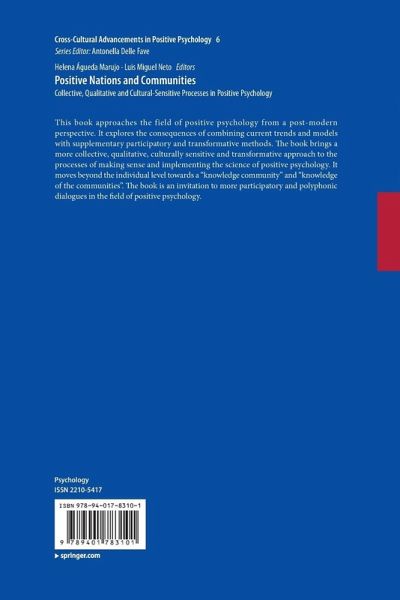 Preface; Ruut Veenhoven.- Introduction: Towards a Participatory and Ethical Consciousness in Positive Psychology; Helena Águeda Marujo and Luis Miguel Neto.- Part I. Introductory Perspectives.- Chapter 1. Two Images: Rhizome and the Gift Exchange in Life and Service; Christopher J. Kinman.- Chapter 2. Positive Institutions, Communities, and Nations: Methods and Internationalizing Positive Psychology Concepts; Grant J. Rich.- Part II. Display of Psychological Attributes: From Personal to Social.- Chapter 3. The Altruism Spiral: An Integrated Model for a Harmonious Future; Lawrence Soosai-Nathan and Antonella Delle Fave.- Chapter 4. The Importance of Friendship in the Construction of Positive Nations; Graciela Tonon and Lía Rodriguez de la Vega.- Chapter 5. Satsang: A Culture Specific Effective Practice for Well-Being; Kamlesh Singh, Anjali Jain and Dalbir Singh.- Chapter 6. Co-curricular Activities and Student Development: How Positive Nations encourage students to pursue careers in Psychology; Mercedes A. McCormick, Grant J. Rich, Deborah Harris O'Brien and Annie Chai.- Part III. Realization: From Individual to Collective.- Chapter 7. The European Championship as a Positive Festivity: Changes in Strenghts of Character Before, During and After the Euro 2008 in Switzerland; René Proyer, Fabian Gander, Sara Wellenzohn and Willibald Ruch.- Chapter 8. Positive Psychology and Interpersonal Forgiveness within Cultures; Julio R. Neto, Robert Enright, Bruna Seibel and Silvia Koller.- Chapter 9. South Africa's Truth and Reconciliation Process as Applied Positive Psychology in Nation Building; Marié P. Wissing and Q. Michael Temane.- Part IV- Agency: From Passive to Active.- Chapter 10. Gross National Happiness: A Case Example of a Himalayan Kingdom's Attempt to Build Positive Nations; George W. Burns.- Chapter 11. The Revolution of Happiness and the Happiness of Political Revolutions: Reflections around the Portuguese Case; Miguel Pereira Lopes,Patricia Jardim da Palma and Telmo Ferreira Alves.- Chapter 12. Positive Community Psychology and Positiv Community Development: Research and Intervention as Transformative Appreciative Actions; Luis Miguel Neto and Helena Águeda Marujo.-Chapter 13. From South West Africa to Namibia: Subjective Well-Being Twenty-one Years after Independence; S. Rothmann and Martina Perstling.