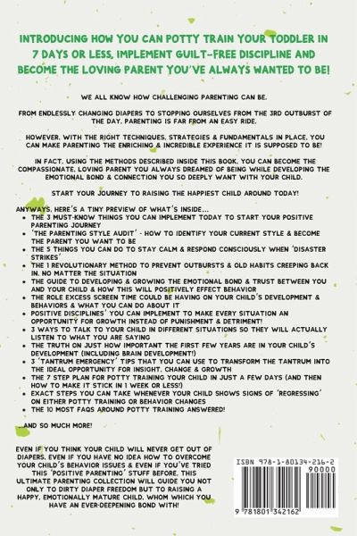 Introducing How You Can Potty Train Your Toddler In 7 Days Or Less, Implement Guilt-Free Discipline & Become The Loving Parent You've Always Wanted To Be! We all know how challenging parenting can be. From endlessly changing diapers to stopping ourselves from the 3rd outburst of the day, parenting is far from an easy ride. However, with the right techniques, strategies & fundamentals in place, you can make parenting the enriching & incredible experience it is supposed to be! In fact, using the methods described inside this book, you can become the compassionate, loving parent you always dreamed of being while developing the emotional bond & connection you so deeply want with your child. And, to add to that, you can use these methods to transform your Child & Toddler's behavior without the need for endless tantrums, power struggles, or bribing. Instead, you can create a peaceful, loving environment where both you and your children can grow and connect. Start your journey to raising the happiest child around today! Anyways, Here's A Tiny Preview Of What's Inside...The 3 Must-Know Things You Can Implement Today To Start Your Positive Parenting Journey 'The Parenting Style Audit' How To Identify Your Current Style & Become The Parent You Want To Be The 5 Things You Can Do To Stay Calm & Respond Consciously When 'Disaster Strikes' The 1 Revolutionary Method To Prevent Outbursts & Old Habits Creeping Back In, No Matter The Situation The Guide To Developing & Growing The Emotional Bond & Trust Between You And Your Child & How This Will Positively Effect Behavior The Role Excess Screen Time Could Be Having On Your Child's Development & Behaviors & What You Can Do About It 'Positive Disciplines' You Can Implement To Make Every Situation An Opportunity For Growth Instead Of Punishment & Detriment! 3 Ways To Talk To Your Child In Different Situations So They Will Actually Listen To What You Are Saying The Truth On Just How Important The First Few Years Are In Your Child's Development (Including Brain Development!) 3 'Tantrum Emergency' Tips That You Can Use To Transform The Tantrum Into The Ideal Opportunity For Insight, Change & Growth The 7 Step Plan For Potty Training Your Child In Just A Few Days (And Then How To Make It Stick In 1 WEEK Or Less!) Exact Steps You Can Take Whenever Your Child Shows Signs Of 'Regressing' On Either Potty Training Or Behavior Changes The 10 Most FAQs Around Potty Training ANSWERED! ...And SO Much More! Even if you think your child will never get out of diapers, even if you have no idea how to overcome your Child's behavior issues & even if you've tried this 'positive parenting' stuff before, this ultimate parenting collection will guide you not only to Dirty Diaper freedom but to raising a happy, emotionally mature child, whom which you have an ever-deepening bond with! So, if You Want The Guidemap To Dirty Diaper Freedom, Guilt-Free Discipline & Positive Parenting Strategies To Raise A Happy, Emotionally Healthy Child, Then Scroll Up And Click "Add To Cart."
