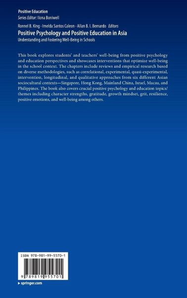 This book explores students' and teachers' well-being from positive psychology and education perspectives and showcases interventions that optimize well-being in the school context. The book also covers crucial positive psychology and education topics/themes including character strengths, gratitude, growth mindset, grit, resilience, positive emotions, and well-being among others. The chapters include reviews and empirical research based on diverse methodologies, such as correlational, experimental, quasi-experimental, intervention, longitudinal, and qualitative approaches from six different Asian sociocultural contexts-Singapore, Hong Kong, Mainland China, Israel, Macau, and Philippines. All the chapters, provide practical pointers for teachers and educators who aim to nurture well-being in schools.