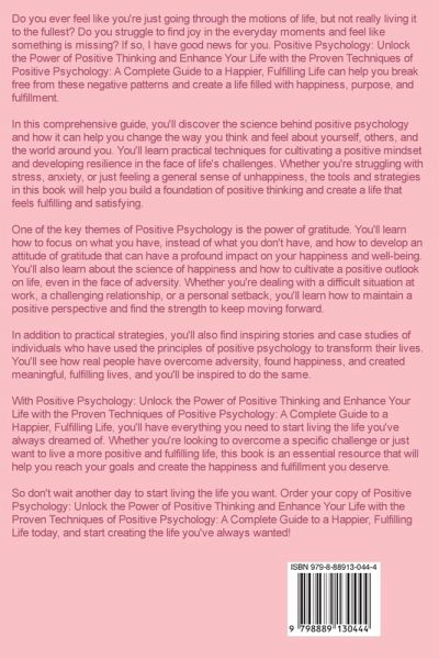 Do you ever feel like you're just going through the motions of life, but not really living it to the fullest? Do you struggle to find joy in the everyday moments and feel like something is missing? If so, I have good news for you. Positive Psychology: Unlock the Power of Positive Thinking and Enhance Your Life with the Proven Techniques of Positive Psychology: A Complete Guide to a Happier, Fulfilling Life can help you break free from these negative patterns and create a life filled with happiness, purpose, and fulfillment. In this comprehensive guide, you'll discover the science behind positive psychology and how it can help you change the way you think and feel about yourself, others, and the world around you. You'll learn practical techniques for cultivating a positive mindset and developing resilience in the face of life's challenges. Whether you're struggling with stress, anxiety, or just feeling a general sense of unhappiness, the tools and strategies in this book will help you build a foundation of positive thinking and create a life that feels fulfilling and satisfying. One of the key themes of Positive Psychology is the power of gratitude. You'll learn how to focus on what you have, instead of what you don't have, and how to develop an attitude of gratitude that can have a profound impact on your happiness and well-being. You'll also learn about the science of happiness and how to cultivate a positive outlook on life, even in the face of adversity. Whether you're dealing with a difficult situation at work, a challenging relationship, or a personal setback, you'll learn how to maintain a positive perspective and find the strength to keep moving forward. In addition to practical strategies, you'll also find inspiring stories and case studies of individuals who have used the principles of positive psychology to transform their lives. You'll see how real people have overcome adversity, found happiness, and created meaningful, fulfilling lives, and you'll be inspired to do the same. With Positive Psychology: Unlock the Power of Positive Thinking and Enhance Your Life with the Proven Techniques of Positive Psychology: A Complete Guide to a Happier, Fulfilling Life, you'll have everything you need to start living the life you've always dreamed of. Whether you're looking to overcome a specific challenge or just want to live a more positive and fulfilling life, this book is an essential resource that will help you reach your goals and create the happiness and fulfillment you deserve. So don't wait another day to start living the life you want. Order your copy of Positive Psychology: Unlock the Power of Positive Thinking and Enhance Your Life with the Proven Techniques of Positive Psychology: A Complete Guide to a Happier, Fulfilling Life today, and start creating the life you've always wanted!