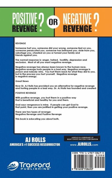 REVENGER Someone hurt you, someone did your wrong, someone lied on you, someone persecuted you, someone has betrayed you, stole from you, sabotage you, cheated on you or turned your family and friends against you. The normal response is: anger, hatred, hostility, depression and seclusion. Most of all you want negative revenge. Negative revenge has always been known to the human race. Negative revenge hurts people in a bad way. Negative revenge is poison and nobody hurt yourself. Negative revenge is negative energy. Great News Now Dr. AJ Rolls has provided you an alternative for negative revenge and hurting people in a bad way. Dr. AJ Rolls has founded and created: POSITIVE REVENGE With positive revenge, you hurt them in a positive way that is beneficial and healthy for you and them. God says vengeance is mine. If people can get to God to that point, then you are justified in getting your positive revenge. There are two types of revenge: Negative Revenge and Positive Revenge This book is educating you about both.