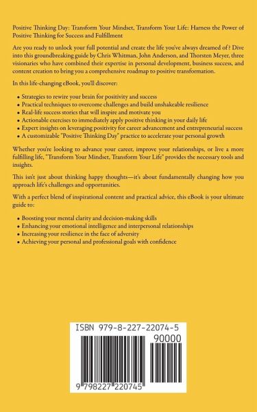 Positive Thinking Day: Transform Your Mindset, Transform Your Life: Harness the Power of Positive Thinking for Success and Fulfillment Are you ready to unlock your full potential and create the life you've always dreamed of? Dive into this groundbreaking guide by Chris Whitman, John Anderson, and Thorsten Meyer, three visionaries who have combined their expertise in personal development, business success, and content creation to bring you a comprehensive roadmap to positive transformation. In this life-changing eBook, you'll discover:Strategies to rewire your brain for positivity and success Practical techniques to overcome challenges and build unshakeable resilience Real-life success stories that will inspire and motivate you Actionable exercises to immediately apply positive thinking in your daily life Expert insights on leveraging positivity for career advancement and entrepreneurial success A customizable "Positive Thinking Day" practice to accelerate your personal growth Whether you're looking to advance your career, improve your relationships, or live a more fulfilling life, "Transform Your Mindset, Transform Your Life" provides the necessary tools and insights. This isn't just about thinking happy thoughts-it's about fundamentally changing how you approach life's challenges and opportunities. With a perfect blend of inspirational content and practical advice, this eBook is your ultimate guide to:Boosting your mental clarity and decision-making skills Enhancing your emotional intelligence and interpersonal relationships Increasing your resilience in the face of adversity Achieving your personal and professional goals with confidence