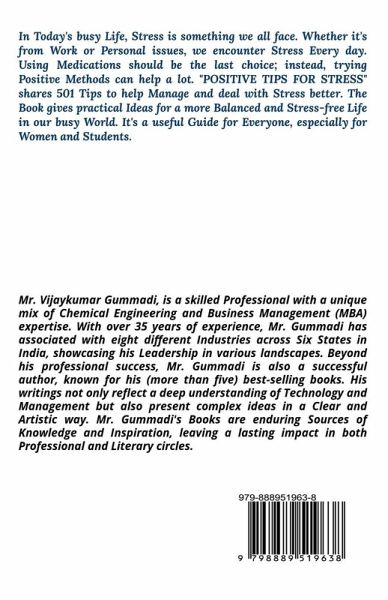In our Modern Lifestyle, Stress is inevitable for Everyone. Whether it's Work-related or Personal, we all encounter Stress on a Daily basis. Turning to Medications should be the last option; instead, adopting Positive Methods can make a significant difference. "POSITIVE TIPS FOR STRESS" presents 501 Life-changing Tips for effectively Managing and Coping with Stress. This Book offers practical strategies for leading a more balanced and Stress-free Life in Today's demanding World. This Book is a valuable Resource for Everyone, especially Women and Students.