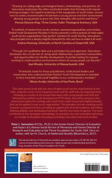 This open access book tells the story of eight youth service organizations in the USA, using the voices of the impacted youth and the staff who accompanied them. Drawing on a series of structured interviews with young people and staff and informed by positive youth development (PYD), ideas the author proposes nine universal principles for working with youth from under-resourced neighborhoods that can be applied to any youth organization. The principles include orienting youth towards a purposeful future, providing an opportunity to build academic and critical thinking abilities, and developing individual's identity and sense of agency. The book contributes to the emerging methodology of principles-focused evaluation and draws on range of disciplines including psychology, education and youth studies. The ebook editions of this book are available open access under a CC BY-NC-ND 4.0 licence on bloomsburycollections.com. Open access was funded by the Thrive Foundation.
