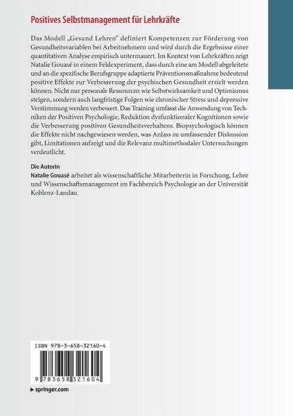 Das Modell "Gesund Lehren" definiert Kompetenzen zur Förderung von Gesundheitsvariablen bei Arbeitnehmern und wird durch die Ergebnisse einer quantitativen Analyse empirisch untermauert. Im Kontext von Lehrkräften zeigt Natalie Gouasé in einem Feldexperiment, dass durch eine am Modell abgeleitete und an die spezifische Berufsgruppe adaptierte Präventionsmaßnahme bedeutend positive Effekte zur Verbesserung der psychischen Gesundheit erzielt werden können. Nicht nur personale Ressourcen wie Selbstwirksamkeit und Optimismus steigen, sondern auch langfristige Folgen wie chronischer Stress und depressive Verstimmung werden verbessert. Das Training umfasst die Anwendung von Techniken der Positiven Psychologie, Reduktion dysfunktionaler Kognitionen sowie die Verbesserung positiven Gesundheitsverhaltens. Biopsychologisch können die Effekte nicht nachgewiesen werden, was Anlass zu umfassender Diskussion gibt, Limitationen aufzeigt und die Relevanz multimethodaler Untersuchungen verdeutlicht.