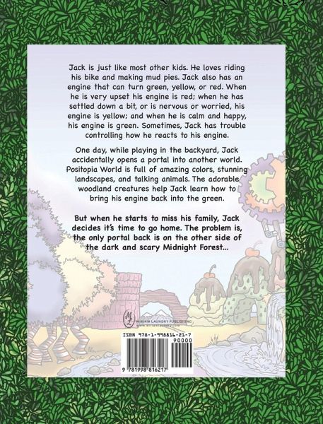 Jack is just like most other kids. He loves riding his bike and making mud pies. Jack also has an engine that can turn green, yellow, or red. When he is very upset his engine is red; when he has settled down a bit, or is nervous or worried, his engine is yellow; and when he is calm and happy, his engine is green. Sometimes, Jack has trouble controlling how he reacts to his engine. One day, while playing in the backyard, Jack accidentally opens a portal into another world. Positopia World is full of amazing colors, stunning landscapes, and talking animals. The adorable woodland creatures help Jack learn how to bring his engine back into the green. But when he starts to miss his family, Jack decides it's time to go home. The problem is, the only portal back is on the other side of the dark and scary Midnight Forest...