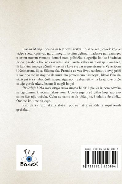 Duan Miklja, doajen naeg novinarstva i pisane re¿i, ¿ovek koji je video sveta, opisivao ga u mnogim svojim delima i nadasve ga razumeo, u svom novom romanu donosi nam politi¿ku alegoriju koliko i istinitu pri¿u, parabolu koliko i razvidnu sliku sveta kakav nam ostaje u amanet, ili kakvim smo ga üinili - zavisi s koje ste zaräene strane: s Vevericom i Neimarom, ili sa Silama zla. Premda ¿e vas ivot zaodenut u ovoj pri¿i u sve ono to nastojimo da unitimo povremeno nasmejati, likovi Sila zla skriveni iza simboli¿nih imena sigurno i razbesneti - na kraju ove pri¿e ostaje gorak ukus. Jesmo li mogli bolje? Poslednje bitka uöi kraja sveta mogla bi biti i pouka iz pera ¿oveka sa ogromnim ivotnim iskustvom. Upozorenje pred bitku koja zapravo samo to nije pöela. ¿eka se samo zvuk pitaljke, i odakle ¿e döi... Onome ko ume da ¿uje. Kao da su ljudi ikada sluali pouke i ita naüili iz sopstvenih greaka...