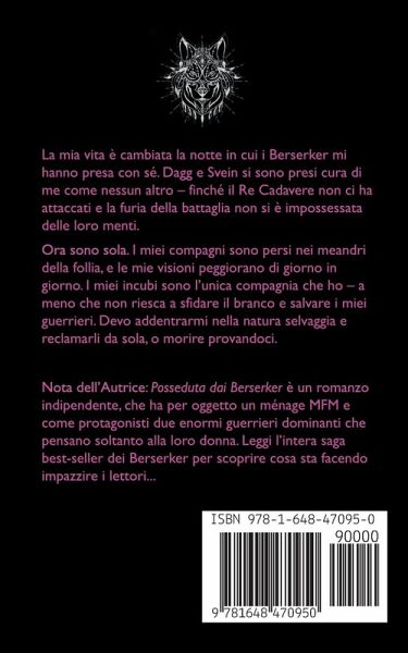 La mia vita è cambiata la notte in cui i Berserker mi hanno presa con sé. Dagg e Svein si sono presi cura di me come nessun altro - finché il Re Cadavere non ci ha attaccati e la furia della battaglia non si è impossessata delle loro menti. Ora sono sola. I miei compagni sono persi nei meandri della follia, e le mie visioni peggiorano di giorno in giorno. I miei incubi sono l'unica compagnia che ho - a meno che non riesca a sfidare il branco e salvare i miei guerrieri. Devo addentrarmi nella natura selvaggia e reclamarli da sola, o morire provandoci. Nota dell'Autrice: Posseduta dai Berserker è un romanzo indipendente, che ha per oggetto un ménage MFM e come protagö nisti due enormi guerrieri dominanti che pensano soltanto alla loro donna. Leggi l'intera saga best-seller dei Berserker per scoprire cosa sta facendo impazzire i lettori...