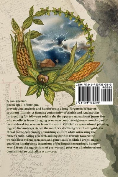 A Faulknerian, poetic spell of intrigue, bravado, melancholy and humor set in a long-forgotten corner of southern Illinois. A farming community of Amish and Anabaptists in-breeding for 160 years told in the first-person narrative of Justus Roe, who recollects from his aging years to recount an eighteen-month span of record-breaking seasons from his youth. Officially a generational planting log, we live and experience the mother's declining health alongside the threat to the community's vanishing culture while witnessing the father's culminating research and mysterious travails toward the world's first hybrid corn seed and genetically modified crops, naively guarding his altruistic intentions of feeding an increasingly hungry world from the aggressions of pre-war and post-war administrations determined to capitalize at any cost.