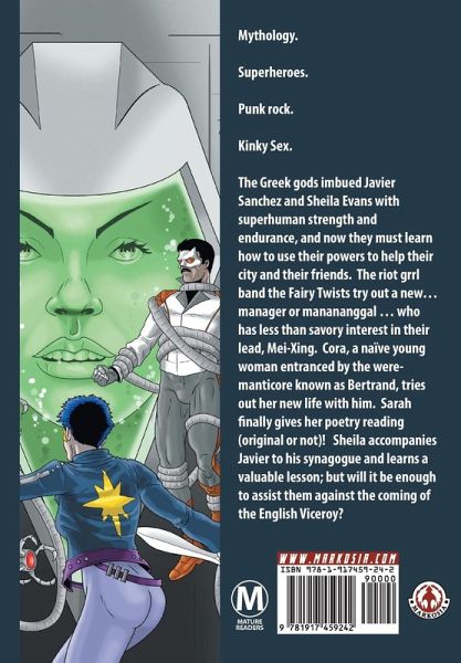Mythology. Superheroes. Punk rock. Kinky Sex. The Greek gods imbued Javier Sanchez and Sheila Evans with superhuman strength and endurance, and now they must learn how to use their powers to help their city and their friends. The riot grrl band the Fairy Twists try out a new... manager or manananggal ... who has less than savoury interest in their lead, Mei-Xing. Cora, a naïve young woman entranced by the were-manticore known as Bertrand, tries out her new life with him. Sarah finally gives her poetry reading (original or not)! Sheila accompanies Javier to his synagogue and learns a valuable lesson; but will it be enough to assist them against the coming of the English Viceroy?