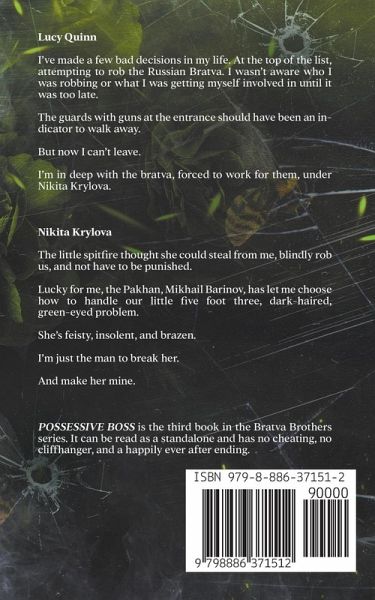 Lucy Quinn I've made a few bad decisions in my life. At the top of the list, attempting to rob the Russian Bratva. I wasn't aware who I was robbing or what I was getting myself involved in until it was too late. The guards with guns at the entrance should have been an indicator to walk away. But now I can't leave. I'm in deep with the bratva, forced to work for them, under Nikita Krylova. Nikita Krylova The little spitfire thought she could steal from me, blindly rob us, and not have to be punished. Lucky for me, the Pakhan, Mikhail Barinov, has let me choose how to handle our little five foot three, dark-haired, green-eyed problem. She's feisty, insolent, and brazen. I'm just the man to break her. And make her mine. Possessive Boss is the third book in the Bratva Brothers series. It can be read as a standalone and has no cheating, no cliffhanger, and a happily ever after ending.