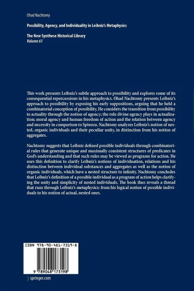 Leibniz's notion of possibility is one of his most significant contributions to philosophy as well as one of the cornerstones of his metaphysics. This work attempts to bring out the intrinsic subtlety of Leibniz's approach to possibility and to explore some of its important repercussions in his metaphysics. This project involves an examination of some of the most difficult questions in Leibniz's metaphysics from this vantage point. The book consists of three parts, the first focusing on Leibniz's notion of possibility, the second on his notion of agency, and the third on his notion of individuality. Leibniz's preoccupation with the notions of possibility, agency and individuality is evident in his early writings as well as in his later ones. His combinatorial insights regarding the notion of possibility as a model for creating the world, his commitment to the traditional doctrine that activity constitutes being, and his view that individuals are the only true beings are among theformative and persisting tenets of his metaphysics. This work explores these tenets in some detail and seeks to highlight the connections between them. The first part of the book presents Leibniz's approach to possibility by exposing his early presuppositions about the status and nature of possibilities (chapter 1); his notion of possible individuals (chapter 2); and his notion of possible worlds as constituted by the relations among possible individuals (chapters 3 and 4). The second part discusses the transition from possibility to actuality through the notion of agency.
