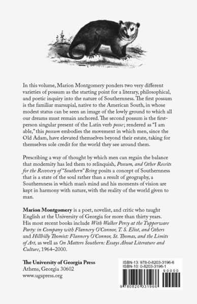 In this volume, Marion Montgomery ponders two very different varieties of possum as the starting point for a literary, philosophical, and poetic inquiry into the nature of Southernness: the familiar marsupial and the first-person singular present of the Latin verb posse; rendered as "I am able."
