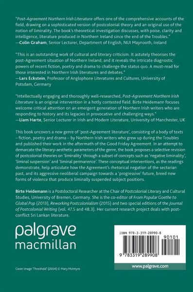 This book uncovers a new genre of 'post-Agreement literature', consisting of a body of texts - fiction, poetry and drama - by Northern Irish writers who grew up during the Troubles but published their work in the aftermath of the Good Friday Agreement. In an attempt to demarcate the literary-aesthetic parameters of the genre, the book proposes a selective revision of postcolonial theories on 'liminality' through a subset of concepts such as 'negative liminality', 'liminal suspension' and 'liminal permanence.' These conceptual interventions, as the readings demonstrate, help articulate how the Agreement's rhetorical negation of the sectarian past and its aggressive neoliberal campaign towards a 'progressive' future breed new forms of violence that produce liminally suspended subject positions.