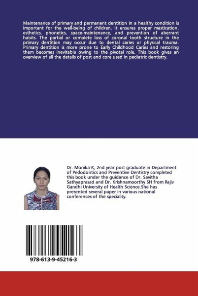 Maintenance of primary and permanent dentition in a healthy condition is important for the well-being of children. It ensures proper mastication, esthetics, phonetics, space-maintenance, and prevention of aberrant habits. The partial or complete loss of coronal tooth structure in the primary dentition may occur due to dental caries or physical trauma. Primary dentition is more prone to Early Childhood Caries and restoring them becomes inevitable owing to the pivotal role. This book gives an overview of all the details of post and core used in pediatric dentistry.