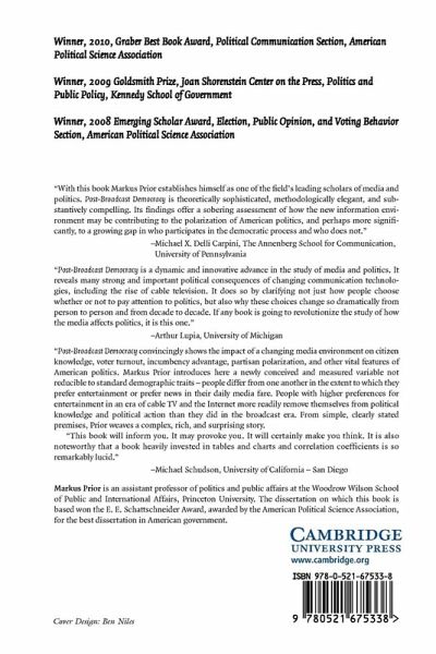 1. Introduction; 2. Conditional political learning; Part I. The Participatory Effects of Media Choice: 3. Broadcast television, political knowledge, and turnout; 4. From low choice to high choice: the impact of cable tv and internet on news exposure, political knowledge, and turnout; 5. From low choice to high choice: does greater media choice affect total news consumption and average turnout?; Part II. The Political Effects of Media Choice: 6. Broadcast television, partisanship, and the incumbency advantage; 7. Partisan polarization in the high-choice media environment; 8. Divided by choice: audience fragmentation and political inequality in the post-broadcast media environment.