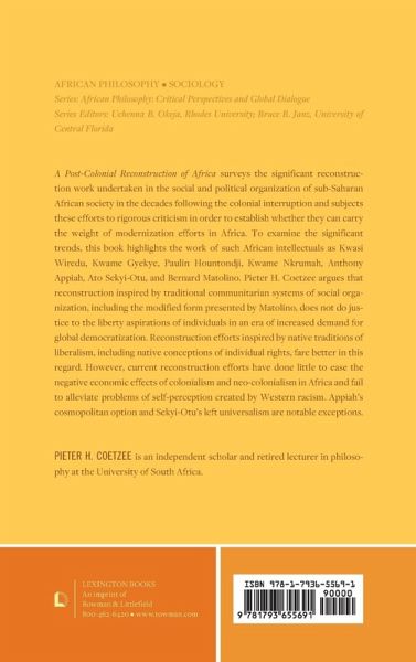 A Post-Colonial Reconstruction of Africa surveys the significant reconstruction work undertaken in the social and political organization of sub-Saharan African society in the decades following the colonial interruption and subjects these efforts to rigorous criticism in order to establish whether they can carry the weight of modernization efforts in Africa. To examine the significant trends, it highlights the work of African intellectuals such as Kwasi Wiredu, Kwame Gyekye, Paulin Hountondji, Kwame Nkrumah, Anthony Appiah, Ato Sekyi-Otu, and Bernard Matolino. Pieter H. Coetzee argues that reconstruction inspired by traditional communitarian systems of social organization, including the modified form presented by Matolino, do not adequately do justice to the liberty aspirations of individuals in an era when the demand for increased democratization has become globally paramount. Reconstruction efforts inspired by appeal to native traditions of liberalism, including native conceptions of individual rights, fare better in this regard. However, current reconstruction efforts have done little to rescue Africans from the negative economic effects of colonialism and neo-colonialism and fail to alleviate self-perception problems created by Western racism. Appiah's cosmopolitan option and Sekyi-Otu's left universalism are notable exceptions.