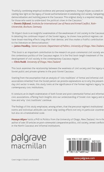 "Dr Aliyev's book is an insightful examination of the weaknesses of civil society in the Caucasus. In detailing the continued impact of the Soviet legacy, he shows how political regimes can have broad-reaching effects long after their demise, and thus makes a fruitful contribution to the literature on democratisation." James Headley, Senior Lecturer, Department of Politics, University of Otago, New Zealand