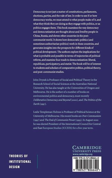 Democracy is not just a matter of constitutions, parliaments, elections, parties and the rule of law. In order to see if or how democracy works, we must attend to what people make of it, and what they think they are doing as they engage with politics, or as politics engages them. This book examines the way democracy and democratization are thought about and lived by people in China, Russia and eleven other countries in the post-communist world. It shows how democratic politics (and sometimes authoritarian politics) work in these countries, and generates insights into the prospects for different kinds of political development. The authors explore the implications for what is probable and possible in terms of trajectories of political reform, and examine four roads to democratization: liberal, republican, participatory and statist. The book will be of interest to students and scholars of comparative politics, political theory and post-communist studies.