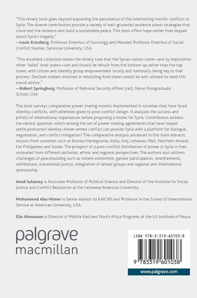 The book surveys comparative power sharing models implemented in societies that have faced identity-conflicts, with attention given to post-conflict design. It analyzes the success and pitfalls of international experiences before proposing a model for Syria. Contributors address the central question: which among the set of power-sharing agreements that have helped settle protracted identity-driven armed conflict can provide Syria with a platform for dialogue, negotiation, and conflict mitigation? The comparative analysis advanced in this book extracts lessons from countries such as Bosnia-Herzegovina, India, Iraq, Lebanon, Mali, Northern Ireland, the Philippines and Sudan. The prospect of a post-conflict distribution of power in Syria is then unraveled from different sectarian, ethnic and regional perspectives. The authors also address challenges of peacebuilding such as violent extremism, gender participation, resettlements, retributions, transitional justice, integration of armed groups and regional and international sponsorship.