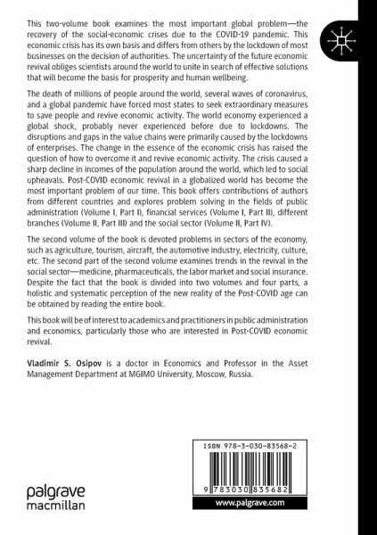 The death of millions of people around the world, several waves of coronavirus, and a global pandemic have forced most states to seek extraordinary measures to save people and revive economic activity. The world economy experienced a global shock, probably never experienced before due to lockdowns. The disruptions and gaps in the value chains were primarily caused by the lockdowns of enterprises. The change in the essence of the economic crisis has raised the question of how to overcome it andrevive economic activity. The crisis caused a sharp decline in incomes of the population around the world, which led to social upheavals. Post-COVID economic revival in a globalized world has become the most important problem of our time. This book offers contributions of authors from different countries and explores problem solving in the fields of public administration (Volume I, Part I), financial services (Volume I, Part II), different branches (Volume II, Part III) and the social sector (Volume II, Part IV).