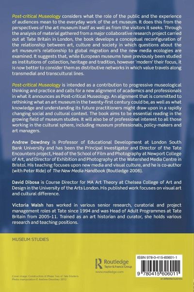 Post-Critical Museology considers what the role of the public and the experience of audiences means to the everyday work of the art museum. It does this from the perspectives of the art museum itself as well as from the visitors it seeks. Through the analysis of material gathered from a major collaborative research project carried out at Tate Britain in London the book develops a conceptual reconfiguration of the relationship between art, culture and society in which questions about the art museum's relationship to global migration and the new media ecologies are examined. It suggests that whilst European museums have previously been studied as institutions of collection, heritage and tradition, however 'modern' their focus, it is now better to consider them as distributive networks in which value travels along transmedial and transcultural lines. Post-Critical Museology is intended as a contribution to progressive museological thinking and practice and calls for a new alignment of academics and professionals in what it announces as post-critical museology. An alignment that is committed to rethinking what an art museum in the twenty-first century could be, as well as what knowledge and understanding its future practitioners might draw upon in a rapidly changing social and cultural context. The book aims to be essential reading in the growing field of museum studies. It will also be of professional interest to all those working in the cultural sphere, including museum professionals, policy makers and art managers.