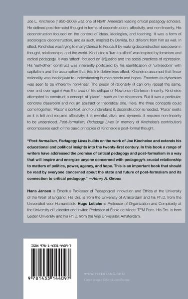 Joe L. Kincheloe (1950-2008) was one of North America's leading critical pedagogy scholars. He defined post-formalist thought in terms of deconstruction, affectivity, and non-linearity. His deconstruction focused on the context of ideas, ideologies, and teaching. It was a form of sociological deconstruction, and as such, inspired by Derrida, but different from him as well. In effect, Kincheloe was trying to marry Derrida to Foucault by making deconstruction see power in thought, relationships, and the world. Kincheloe's 'turn to affect' was inspired by feminism and radical pedagogy. It was 'affect' focused on (in)justice and the social practices of repression. His 'self-other' construct was inherently politicized by his identification of 'unfreedom' with capitalism and the assumption that this link determines affect. Kincheloe assumed that linear rationality was inadequate to understanding human needs and hopes. Freedom as dynamism was seen to be inherently non-linear. The prison of rationality (it can only repeat the same, over and over again) was the crux of his critique of Newtonian-Cartesian linearity. Kincheloe attempted to construct a concept of 'place'-such as the classroom. But it was a particular, concrete classroom and not an abstract or theoretical one. Here, the three concepts could come together. 'Place' is context, and to understand it, deconstruction is needed. 'Place' exists as it is felt and requires affectivity; it is eventful, alive, and dynamic. It requires non-linearity to be understood. Post-formalism, Pedagogy Lives (in memory of Kincheloe's contribution) encompasses each of the basic principles of Kincheloe's post-formal thought.