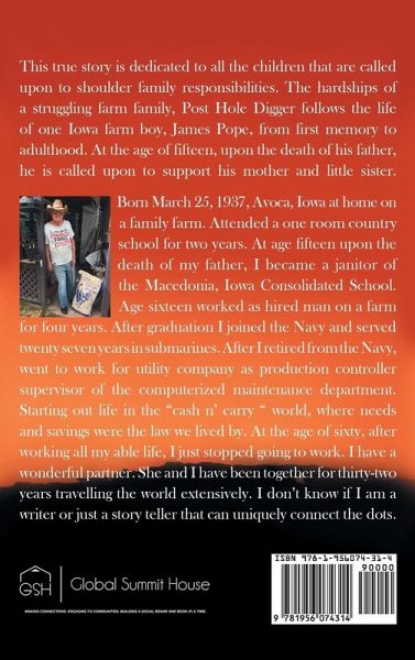 -- This true story is dedicated to all the children that are called upon to shoulder family responsibilities. The hardships of a struggling farm family, Post Hole Digger follows the life of one Iowa farm boy, James Pope, from first memory to adulthood. At the age of fifteen, upon the death of his father, he is called upon to support his mother and little sister.