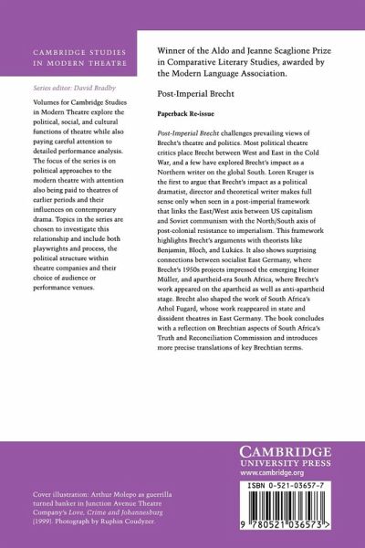 Post-Imperial Brecht challenges prevailing views of Brecht's theatre and politics. Most political theatre critics place Brecht between West and East in the Cold War, and a few have recently explored Brecht's impact as a Northern writer on the global South. Loren Kruger is the first to argue that Brecht's impact as a political dramatist, director and theoretical writer makes full sense only when seen in a post-imperial framework that links the East/West axis between US capitalism and Soviet communism with the North/South axis of postcolonial resistance to imperialism. This framework highlights Brecht's arguments with theorists like Benjamin, Bloch, and Lukacs. It also shows surprising connections between socialist East Germany, where Brecht's 1950s projects impressed the emerging Heiner Müller, and apartheid-era South Africa, where his work appeared on the apartheid as well as anti-apartheid stage.