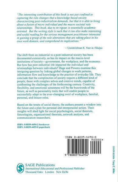 The move from an industrial to a post-industrial society has been documented by many, as has the impact of this new order on the macro-level institutions of society - government, the workplace and the economy. But what does post-industrial life mean to the individual and for relationships between people? Hage and Powers examine that question, linking global changes in the work patterns, information flow and knowledge to the practice of everyday life. Their answer is that the complexification of society requires a different kind of person. Creativity, flexibility and emotional astuteness will become the watchwords of the future, personality traits that will enable people to successfully adapt to the ever-changing swirl of workplace, familial, personal and leisure roles. Based on the tenets of social theory, the authors present both a vision of the future and a plan for personal and interpersonal action.