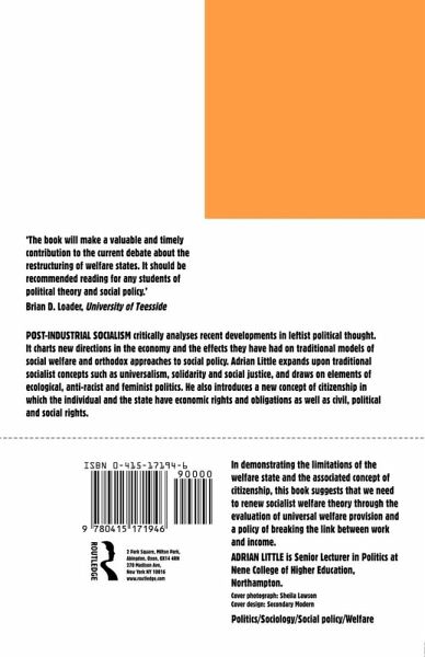 Post-Industrial Socialism provides critical analysis of recent developments in leftist political thought. Adrian Little charts new directions in the economy and the effects they have had on traditional models of social welfare and orthodox approaches to social policy. In demonstrating the limitations of the welfare state and the associated concept of citizenship, this book suggests that we need to renew socialist welfare theory through the evaluation of universal welfare provision and a policy of breaking the link between work and income.