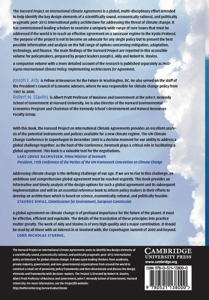 International Advisory Board, Harvard Environmental Economics Program; Faculty Steering Committee, Harvard Project on International Climate Agreements; Management, Harvard Project on International Climate Agreements; List of contributors; Foreword; Introduction and overview; Lessons for the International Policy Community; References; Appendix 1. Summaries of research initiatives, Harvard Project on International Climate Agreements; Part I. Alternative International Policy Architectures: 1. An elaborated proposal for global climate policy architecture: specific formulas and emission targets for all countries in all decades; 2. The EU emission trading scheme: a prototype global system?; 3. Linkage of tradable permit systems in international climate policy architecture; 4. The case for charges on greenhouse gas emissions; 5. Towards a global compact for managing climate change; 6. Sectoral approaches to a post-Kyoto international climate policy framework; 7. A portfolio system of climate treaties; Part II. Negotiation, Assessment, and Compliance: 8. How to negotiate and update climate agreements; 9. Metrics for evaluating policy commitments in a fragmented world: the challenges of equity and integrity; 10. Justice and climate change; 11. Toward a post-Kyoto climate change architecture: a political analysis; Part III. The Role and Means of Technology Transfer: 12. International climate technology strategies; 13. Mitigation through resource transfers to developing countries: expanding greenhouse gas offsets; 14. Possible development of a technology clean development mechanism in a post 2012 regime; Part IV. Global Climate Policy and International Trade: 15. Global environment and trade policy; 16. A proposal for the design of the successor to the Kyoto protocol; Part V. Economic Development, Adaptation, and Deforestation: 17. Reconciling human development and climate protection: a multi-stage hybrid climate policy architecture; 18. What do we expect from an international climate agreement? A perspective from a low-income country; 19. Climate accession deals: new strategies for taming growth of greenhouse gases in developing countries; 20. Policies for developing country engagement; 21. International forest carbon sequestration in a post-Kyoto agreement; Part VI. Modeling Impacts of Alternative Allocations of Responsibility: 22. Modeling economic impacts of alternative international climate policy architectures: a quantitative and comparative assessment of architectures for agreement; 23. Sharing the burden of GHG reductions; 24. When technology and climate policy meet: energy technology in an international policy context; 25. Revised emissions projections for China: why post-Kyoto climate policy must look east; 26. Expecting the unexpected: macroeconomic volatility and climate policy; Part VII. Epilogue: 27. Epilogue: implementing architectures for agreement; Appendix 2. Selected list of individuals consulted, Harvard Project on International Climate Agreements; Appendix 3. Workshops and conferences, Harvard Project on International Climate Agreements; Appendix 4. Glossary and abbreviations.