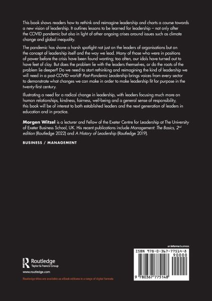 This book shows readers how to rethink and reimagine leadership and charts a course towards a new vision of leadership. It outlines lessons to be learned for leadership - not only after the COVID pandemic but also in light of other ongoing crises around issues such as climate change and global inequality.