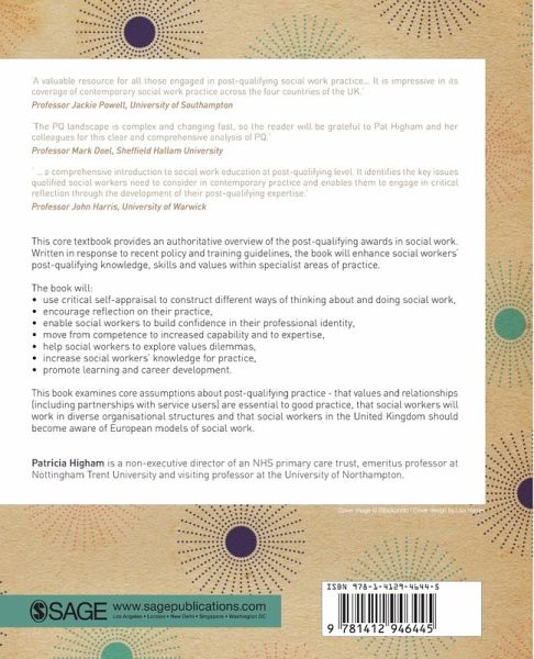 "A valuable resource for all those engaged in post-qualifying social work practice, ... It is impressive in its coverage of contemporary social work practice across the four countries of the UK" Professor Jackie Powell, University of Southampton "The PQ landscape is complex and changing fast, so the reader will be grateful to Pat Higham and her colleagues for this clear and comprehensive analysis of PQ" Professor Mark Doel, Sheffield Hallam University. " a comprehensive introduction to social work education at post-qualifying level. It identifies the key issues qualified social workers need to consider in contemporary practice and enables them to engage in critical reflection through the development of their post-qualifying expertise." Professor John Harris, University of Warwick This core textbook provides an authoritative overview of the post-qualifying awards in social work. Written in response to recent policy and training guidelines, the book will enhance social workers' post-qualifying knowledge, skills and values within specialist areas of practice. The book will: - Use critical self-appraisal to construct different ways of thinking about and doing social work - Encourage reflection on their practice - Enable social workers to build confidence in their professional identity - Move from competence to increased capability and to expertise - Help social workers to explore values dilemmas - Increase social workers' knowledge for practice - Promote learning and career development. This book examines core assumptions about post qualifying practice - that values and relationships (including partnerships with service users) are essential to good practice, that social workers will work in diverse organisational structures and that social workers in the United Kingdom should become aware of European models of social work.