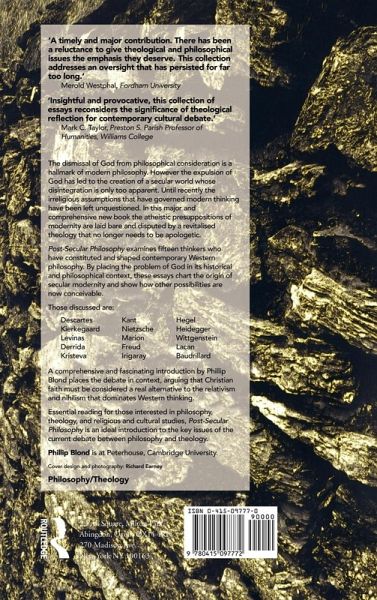 Presumed long-since dead by Nietzsche, God has made a remarkable comeback in the recent work of Derrida and Levinas who have made people think about theology and what it has to offer in light of the nihilism of postmodern thinking. "Post-Secular Philosophy" explores the relationship between theology, the major thinkers of the philosophical tradition, and the broader debates about God within modern philosophy and the role of God in postmodern thought. Beginning with Descartes, Kant and Hegel and ending with Derrida, Levinas and Baudrillard, this book provides a thorough discussion of the philosophical and cultural importance of theology within postmodernism. Fifteen chapters consider each of these philosophers in turn: Descartes, Kant, Hegel, Kierkegaard, Nietzsche, Heidegger, Freud, Wittgenstein, Lacan, Levinas, Derrida, Marion, Kristeva, Irigaray and Baudrillard.