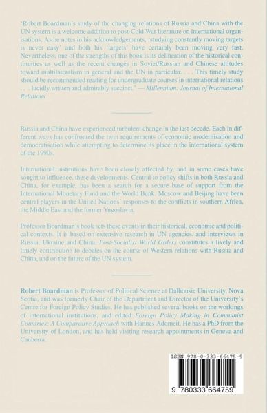 Post-Socialist World Orders presents a study of Soviet/Russian Federation and Chinese policies in selected UN institutions from the early 1980s to the early 1990s. The analysis is set in the context of research in international political economy: Part I focuses on Russia and comprises chapters on foreign policy, relations with international financial institutions, technical agencies, and approaches to peace and security issues. Part II deals with China's foreign policy and economic modernization, and examines policies in the same set of institutions.