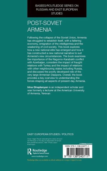 Following the collapse of the Soviet Union, Armenia has struggled to establish itself, with a faltering economy, emigration of the intelligentsia and the weakening of civil society. This book explores how a new national elite has emerged and how it has constructed a new national narrative to suit Armenia's new circumstances. The book examines the importance of the Nagorno-Karabakh conflict with Azerbaijan, considers the impact of fraught relations with Turkey and the impact of relations with other neighbouring states including Russia, and discusses the poorly-developed role of the very large Armenian diaspora. Overall, the book provides a key overview to understanding the forces shaping all aspects of present-day Armenia.