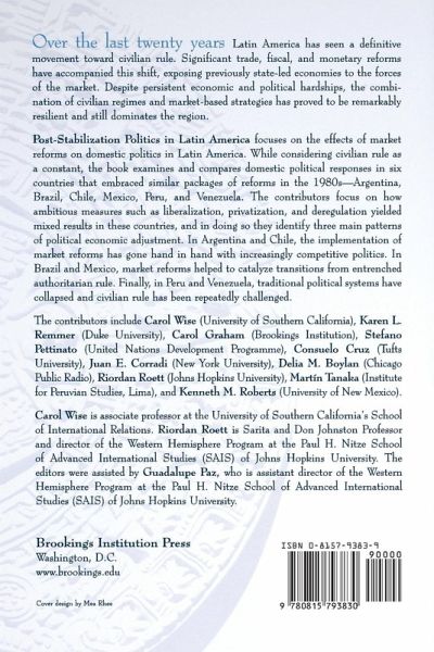 " Over the last twenty years Latin America has seen a definitive movement toward civilian rule. Significant trade, fiscal, and monetary reforms have accompanied this shift, exposing previously state-led economies to the forces of the market. Despite persistent economic and political hardships, the combination of civilian regimes and market-based strategies has proved to be remarkably resilient and still dominates the region. This book focuses on the effects of market reforms on domestic politics in Latin America. While considering civilian rule as a constant, the book examines and compares domestic political responses in six countries that embraced similar packages of reforms in the 1980sArgentina, Brazil, Chile, Mexico, Peru, and Venezuela. The contributors focus on how ambitious measures such as liberalization, privatization, and deregulation yielded mixed results in these countries and in doing so they identify three main patterns of political economic adjustment. In Argentina and Chile, the implementation of market reforms has gone hand in hand with increasingly competitive politics. In Brazil and Mexico, market reforms helped to catalyze transitions from entrenched authoritarian rule. Finally, in Peru and Venezuela, traditional political systems have collapsed and civilian rule has been repeatedly challenged. The contributors include Carol Wise (University of Southern California), Karen L. Remmer (Duke University), Carol Graham (Brookings Institution), Stefano Pettinato (United Nations Development Programme), Consuelo Cruz (Tufts University), Juan E. Corradi (New York University), Delia M. Boylan (Chicago Public Radio), Riordan Roett (Johns Hopkins University), Martíiacute;n Tanaka (Institute for Peruvian Studies, Lima), and Kenneth M. Roberts (University of New Mexico). "
