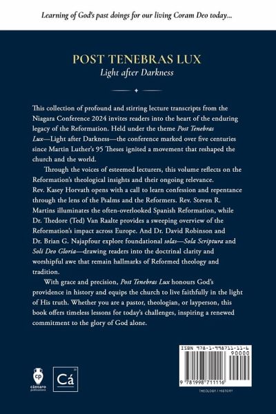 This collection of profound and stirring lecture transcripts from the Niagara Conference 2024 invites readers into the heart of the enduring legacy of the Reformation. Held under the theme Post Tenebras Lux-Light after Darkness-the conference marked over five centuries since Martin Luther's 95 Theses ignited a movement that reshaped the church and the world. Through the voices of esteemed lecturers, this volume reflects on the Reformation's theological insights and their ongoing relevance. Rev. Kasey Horvath opens with a call to learn confession and repentance through the lens of the Psalms and the Reformers. Rev. Steven R. Martins illuminates the often-overlooked Spanish Reformation, while Dr. Ted Van Raalte provides a sweeping overview of the Reformation's impact across Europe. And Dr. David Robinson and Dr. Brian G. Najapfour explore foundational solas-Sola Scriptura and Soli Deo Gloria-drawing readers into the doctrinal clarity and worshipful awe that remain hallmarks of Reformed theology and tradition. With grace and precision, Post Tenebras Lux honours God's providence in history and equips the church to live faithfully in the light of His truth. Whether you are a pastor, theologian, or layperson, this book offers timeless lessons for today's challenges, inspiring a renewed commitment to the glory of God alone.