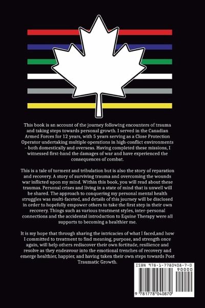 This book is an account of the journey following encounters of trauma and taking steps towards personal growth. I served in the Canadian Armed Forces for 12 years, with 5 years serving as a Close Protection Operator undertaking multiple operations in high-conflict environments - both domestically and overseas. Having completed these missions, I witnessed first-hand the damages of war and have experienced the consequences of combat. This is a tale of torment and tribulation but is also the story of reparation and recovery. A story of surviving trauma and overcoming the wounds war inflicted upon my mind. Within this book, you will read about these traumas. Personal crises and living in a state of mind that is unwell will be shared. The approach to conquering my personal mental health struggles was multi-faceted, and details of this journey will be disclosed in order to hopefully empower others to take the first step in their own recovery. Things such as various treatment styles, inter-personal connections and the accidental introduction to Equine Therapy were all supports to becoming a healthier me. It is my hope that through sharing the intricacies of what I faced,and how I committed to treatment to find meaning, purpose, and strength once again, will help others rediscover their own fortitude, resilience and resolve as they endeavour into the emotional trenches of recovery and emerge healthier, happier, and having taken their own steps towards Post Traumatic Growth.
