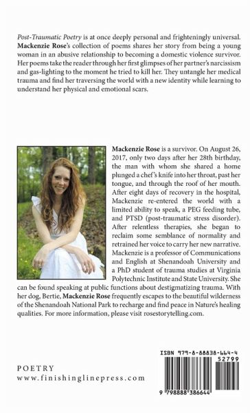 Mackenzie Rose is a survivor. On August 26, 2017, only two days after her 28th birthday, the man with whom she shared a home plunged a chef's knife into her throat, past her tongue, and through the roof of her mouth. After eight days of recovery in the hospital, Mackenzie re-entered the world with a limited ability to speak, a PEG feeding tube, and PTSD (post-traumatic stress disorder). After relentless therapies, she began to reclaim some semblance of normality and retrained her voice to carry her new narrative. Mackenzie is a professor of Communications and English at Shenandoah University and a PhD student of trauma studies at Virginia Polytechnic Institute and State University. She can be found speaking at public functions about destigmatizing trauma. With her dog, Bertie, Mackenzie Rose frequently escapes to the beautiful wilderness of the Shenandoah National Park to recharge and find peace in Nature's healing qualities. For more information, please visit rosestorytelling.com.