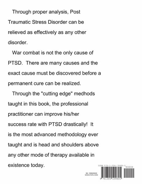 The methodology taught in this book is "cutting edge" therapy for those suffering from the aftermath of psychologically traumatic event(s) in their life. Combat traumas, auto wrecks, death of loved ones; the list goes on and on. The root cause must be discovered and then the associated tension released. This is most effectively achieved through regressive hypnotherapy. It is the greatest method ever devised for personal traumatic events.