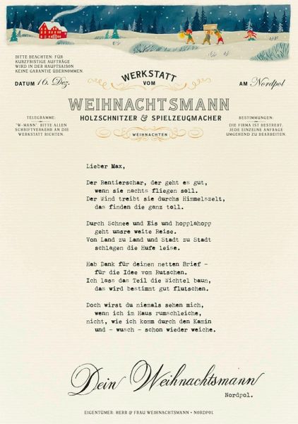 Das aufwendig ausgestattete Buch enthält Postkarten der Wichtel aus der Weihnachtswerkstatt und fünf herausnehmbare, gereimte Briefe vom Weihnachtsmann, in denen er auch Fragen beantwortet, die sich Kinder rund um Weihnachten stellen: Wie können die Rentiere die ganze Nacht fliegen? Und welches Essen wünscht sich der Weihnachtsmann an Heiligabend?