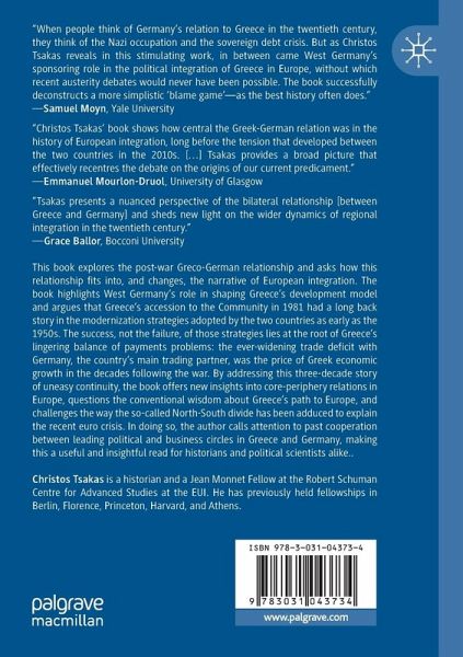This book explores the post-war Greco-German relationship and asks how this relationship fits into, and changes, the narrative of European integration. The book highlights West Germany's role in shaping Greece's development model and argues that Greece's accession to the Community in 1981 had a long back story in the modernization strategies adopted by the two countries as early as the 1950s. The success, not the failure, of those strategies lies at the root of Greece's lingering balance of payments problems: the ever-widening trade deficit with Germany, the country's main trading partner, was the price of Greek economic growth in the decades following the war. By addressing this three-decade story of uneasy continuity, the book offers new insights into core-periphery relations in Europe, questions the conventional wisdom about Greece's path to Europe, and challenges the way the so-called North-South divide has been adduced to explain the recent euro crisis. In doing so, the authorcalls attention to past cooperation between leading political and business circles in Greece and Germany, making this a useful and insightful read for historians and political scientists alike.
